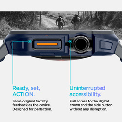 I tagli precisi assicurano un facile accesso a tutte le funzioni e alle porte, consentendo di utilizzare il dispositivo, mentre gli accenti arancioni aggiunti alla cornice integrata e al cinturino aggiungono un tocco unico.