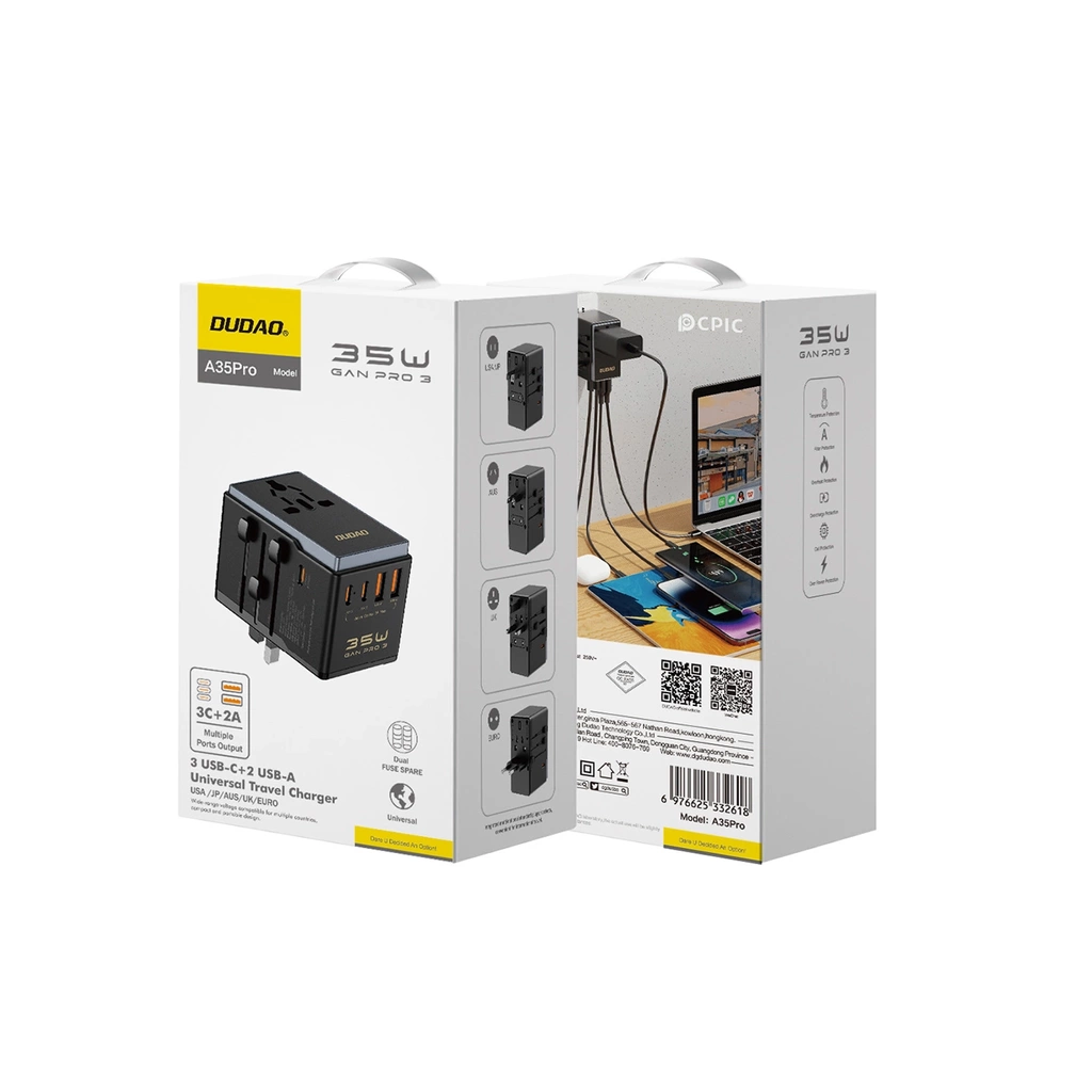 Adapter podróżny Dudao A35Pro 35W z wtyczkami EU / UK / AUS / US / JP, z 3 portami USB-C, 2 portami USB-A - czarny