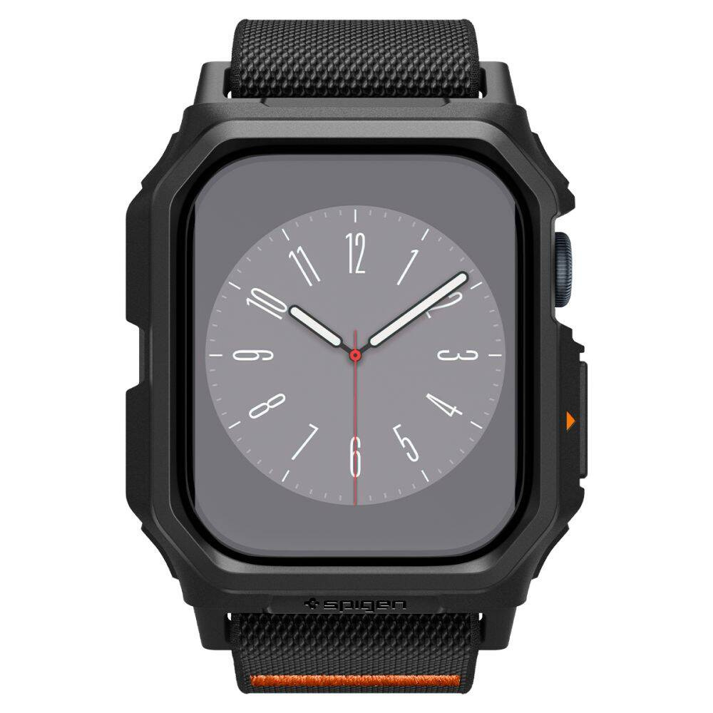 I tagli precisi assicurano un facile accesso a tutte le funzioni e alle porte, consentendo di utilizzare il dispositivo, mentre gli accenti arancioni aggiunti alla cornice integrata e al cinturino aggiungono un tocco unico.