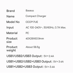 Nabíječka od Baseus vám umožní rezignovat na nošení dvou nabíječek s sebou. To vše díky speciálnímu designu. V horní části zástrčky jsou tři USB vstupy. Díky tomuto řešení se můžete vzdát tří samostatných nabíječek a nahradit ji jednou, která je rozhodně praktičtější a zabere méně místa v kabelce nebo batohu. Další výhodou tohoto řešení je možnost nabíjet tři zařízení současně, přičemž zabírá pouze jednu zásuvku.