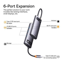 Dokovací stanice Baseus Metal Gleam Series 6 v 1 HUB USB typu C – 3 x USB 3.2 Gen.1 / 1 x napájení / 1 x čtečka karet SD / 1 x čtečka karet TF šedá (WKWG030213)
