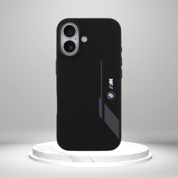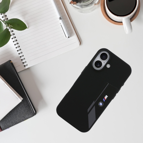 Cechą charakterystyczną tej kolekcji jest pionowy, geometryczny pas w odcieniach czerni i szarości, nawiązujący do sportowej estetyki BMW M. Na powierzchni etui umieszczono logo BMW oraz emblemat M, które podkreślają jego dynamiczny, elegancki charakter. Etui posiada czarną ramkę wokół aparatu oraz zintegrowane osłony przycisków, zapewniające dodatkową ochronę i spójny wygląd.