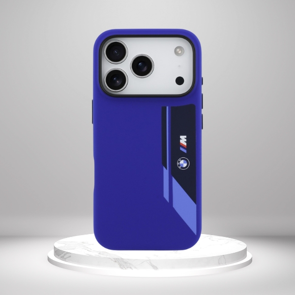 Cechą charakterystyczną tej kolekcji jest pionowy, geometryczny pas w odcieniach granatu i błękitu, nawiązujący do sportowej estetyki BMW M. Na powierzchni etui umieszczono logo BMW oraz emblemat M, które podkreślają jego dynamiczny, elegancki charakter. Etui posiada czarną ramkę wokół aparatu oraz zintegrowane osłony przycisków, zapewniające dodatkową ochronę i spójny wygląd.