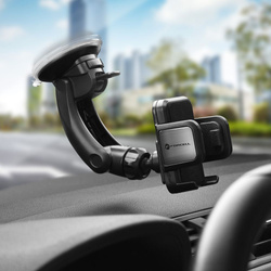 Różne możliwości regulacji ułatwiają dostosowywanie uchwytu do własnych potrzeb, co okaże się przydatne w przypadku współdzielenia jednego auta przez kilku kierowców. Rozstaw ramion jest na tyle szeroki (40–110 mm), że bez problemu przymocujesz do niego różnej wielkości smartfony czy nawigacje, a dolne podpórki uchronią urządzenie przed przypadkowym wyślizgnięciem się. Długie ramię z regulacją 360° pozwoli Ci obracać uchwytem, tak aby uzyskać odpowiedni dla wzroku kąt. Śledź trasę podróży, przeglądaj powiadomienia czy przełączaj piosenki na ekranie urządzenia z zachowaniem całkowitego bezpieczeństwa zarówno swojego, jak i pasażerów.