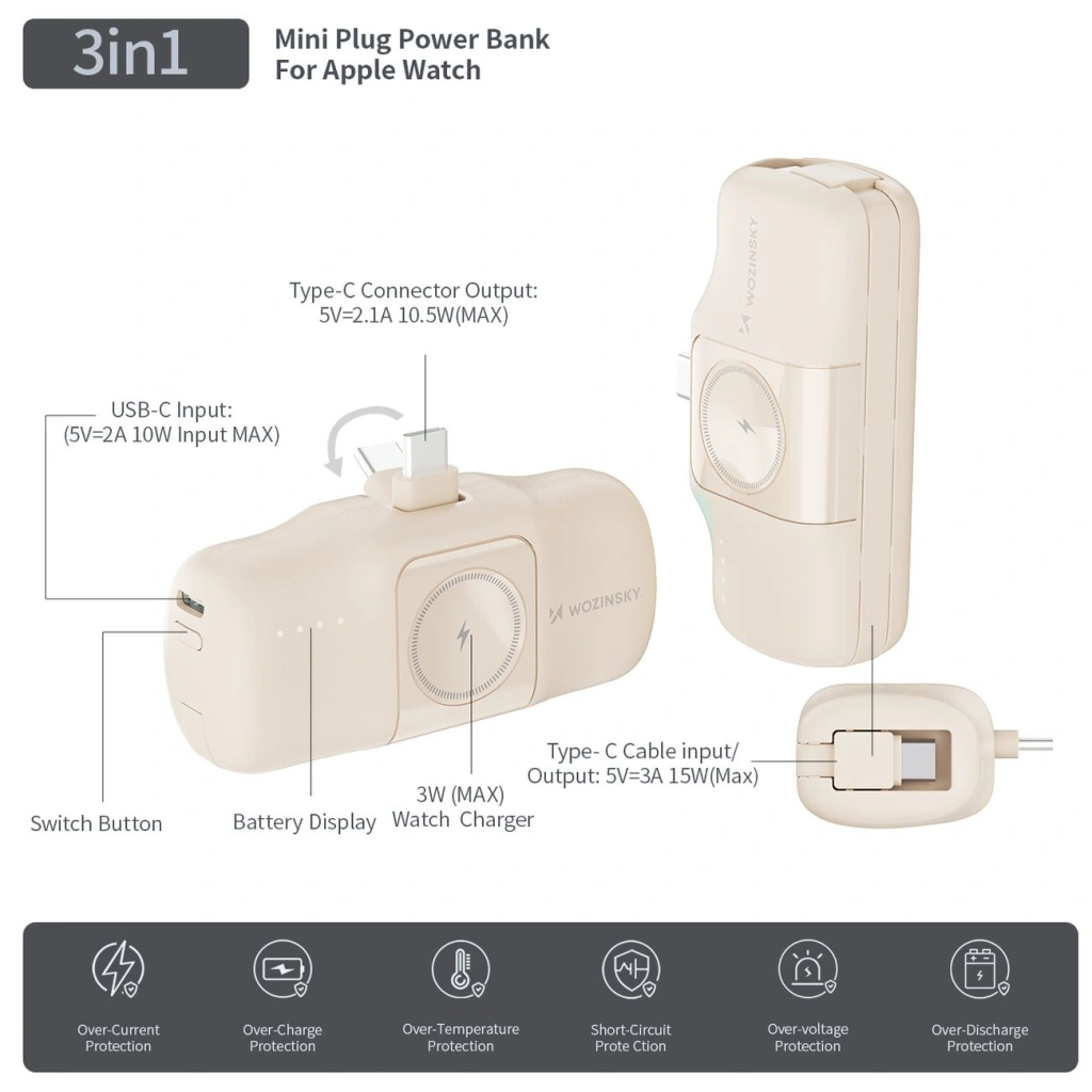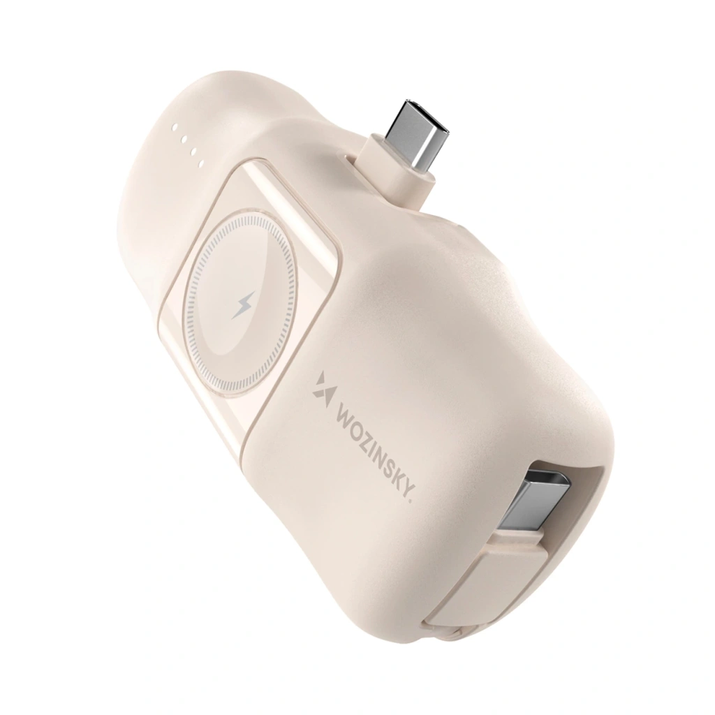 • Mini powerbank Wozinsky WF16-YCS 5000mAh 15W USB-C z wbudowanym kablem USB-C i ładowarką do Apple Watch - beżowy