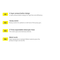 - Má 5 režimů proudění : dešťová sprcha, velká mlha (pro čištění střechy), malá mlha (pro čištění karoserie), vysokotlaká (pro čištění kol) a nízkotlaká (pro čištění skel)