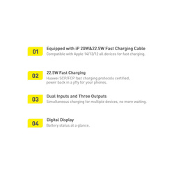 Powerbanka díky použité technologii podporuje možnost rychlého nabíjení zařízení. To znamená, že během několika minut jste schopni nabít svůj telefon nebo jiné zařízení. Velkým usnadněním je také instalace digitálního displeje v přední části. S jeho pomocí můžete pohodlně a rychle zkontrolovat úroveň nabití powerbanky a v případě potřeby ji dobít ještě před odchodem z domova.