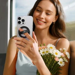 Wbudowany magnes o wysokiej sile przyciągania zapewnia pewne mocowanie smartfona, umożliwiając wygodne korzystanie z uchwytu w dowolnej pozycji.