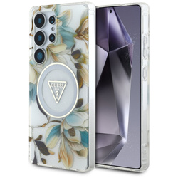 Etui Guess Glitter Flowers Triangle Buttons MagSafe do Samsung Galaxy S25 Ultra biały