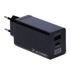 Meet the GaN Wozinsky WWCG01 charger - a portable device for charging most mobile devices , such as phones, tablets, mobile game console or laptop. It has two output ports: 1 x USB and 1 x USB Type C with a maximum power of 65 W, so you can charge two devices at the same time . The charger supports fast charging in accordance with the most popular protocols: Quick Charge 3.0, Power Delivery and Mi Turbo Charge . It has built-in security, incl. against overcharging, overvoltage or overheating.