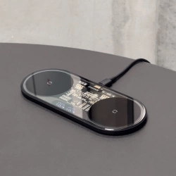 Es ist schwer, das Aussehen dieses Gadgets zu ignorieren. Für seine Herstellung wurde gehärtetes Glas mit Spiegeleffekt verwendet. Die transparenten Elemente auf dem Panel machen die Hardware-Ausstattung wie Chip, Sicherheitsschaltung und andere Komponenten sichtbar. Das Produkt mit minimalistischem Design verfügt über einen versteckten Typ-C-Eingang, der mit den modernsten Geräten auf dem Markt kompatibel ist. Es ermöglicht ein stabiles und effektives Laden. Zusätzlich ist es mit einer digitalen Anzeige ausgestattet, die über die aktuelle Ladeleistung des Gerätes informiert.