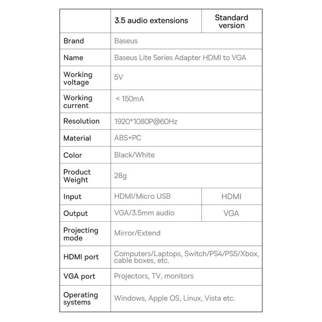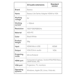 Die Baseus Lite-Serie WKQX010102 ist ein HDMI-zu-VGA-Adapter mit zusätzlichen Micro-USB-Anschlüssen (für die Stromversorgung) und einer 3,5-mm-AUX-Minibuchse, mit der Sie einen neuen Laptop, eine Konsole oder einen Mediaplayer an einen älteren Fernseher, Monitor oder Projektor anschließen können. Ein hervorragendes Gadget, mit dem Sie die neuesten mobilen Geräte an älteren Receivern verwenden können. Sie müssen nicht das neueste TV-Modell kaufen, um ein qualitativ hochwertiges Signal von Ihrem Notebook an dieses zu senden.