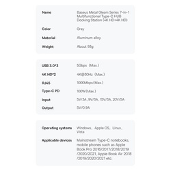 Baseus Metal Gleam Series HUB 7-in-1-USB-Typ-C-Dockingstation – 2 x HDMI / 3 x USB 3.2 Gen. 1/1 x Power Delivery / 1 x RJ-45 Ethernet Grau (WKWG040113)