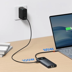 Port wejściowy USB-C obsługuje Power Delivery do 100W, zapewniając ładowanie laptopa z mocą do 85W bez przerywania pracy z innymi urządzeniami.