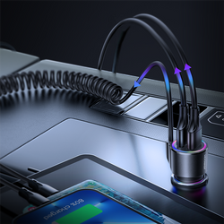 Ein Autoladegerät ist ein grundlegendes Gerät, das heutzutage ein Muss für jedes Auto ist. Autofahrer und insbesondere Berufstätige, die viel Zeit im Auto verbringen, müssen den Akku des Telefons aufladen können, unabhängig davon, wo sie sich gerade befinden. Das Joyroom ist die perfekte Wahl. Dadurch können Sie Telefone und andere elektronische Geräte sehr effizient aufladen. Es verfügt über 2 USB-A-Anschlüsse und ein integriertes 1,5 m langes USB-C-Kabel, mit dem Sie 3 Geräte gleichzeitig aufladen können.