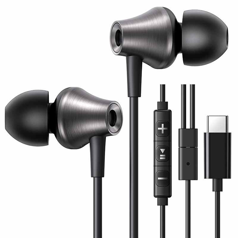 Zbliżenie na czarne przewodowe kopfhörer dokanałowe Ugreen z pilotem i złączem USB-C