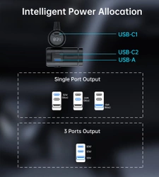 - Lädt mehrere Geräte gleichzeitig auf. Es verfügt über 2 USB-C-Anschlüsse und 1 USB-A-Anschluss, sodass Sie drei Geräte gleichzeitig laden können.