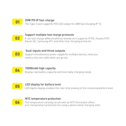 - Ausgänge: USB1 / USB2 (5V / 3A , 9V / 2A, 12V / 1,5A); USB-C (5 V / 3 A, 9 V / 2,22 A, 12 V / 1,5 A)