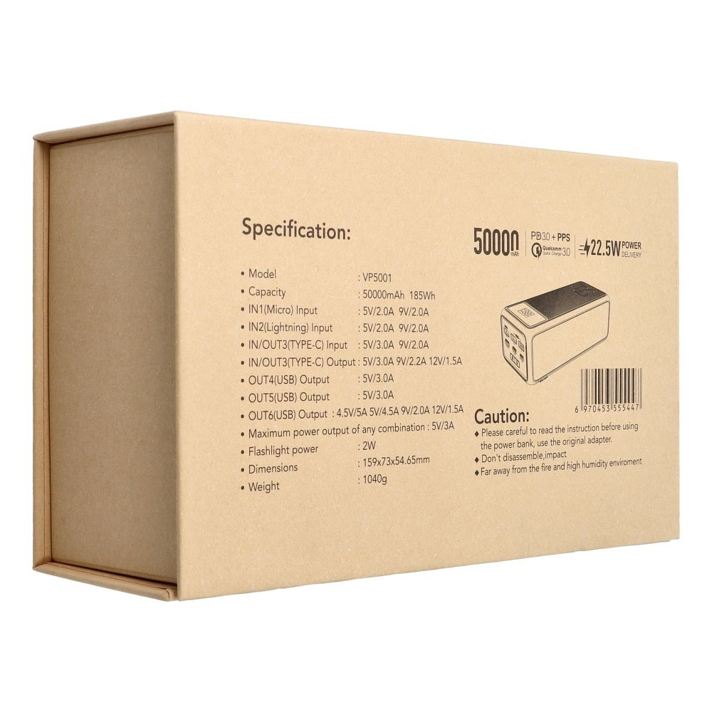 Zastosowanie cenionej na rynku baterii litowo-polimerowej gwarantuje wolniejsze rozładowywanie się power banka. Pojemność na poziomie 50 000 mAh pozwoli Ci kilkukrotnie uzupełnić energię w telefonie, tak że przyda się w trasie, kiedy nie ma stałego dostępu do gniazdek elektrycznych.