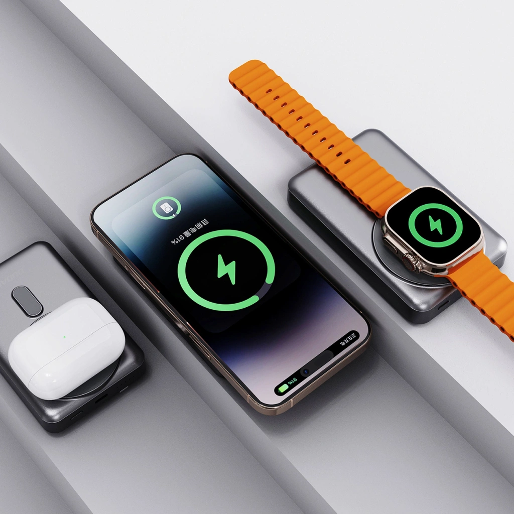 • Ładuj aż cztery urządzenia jednocześnie: Dzięki wbudowanym kablom, gniazdu USB-C i ładowaniu bezprzewodowemu, możesz dzielić się energią z innymi.