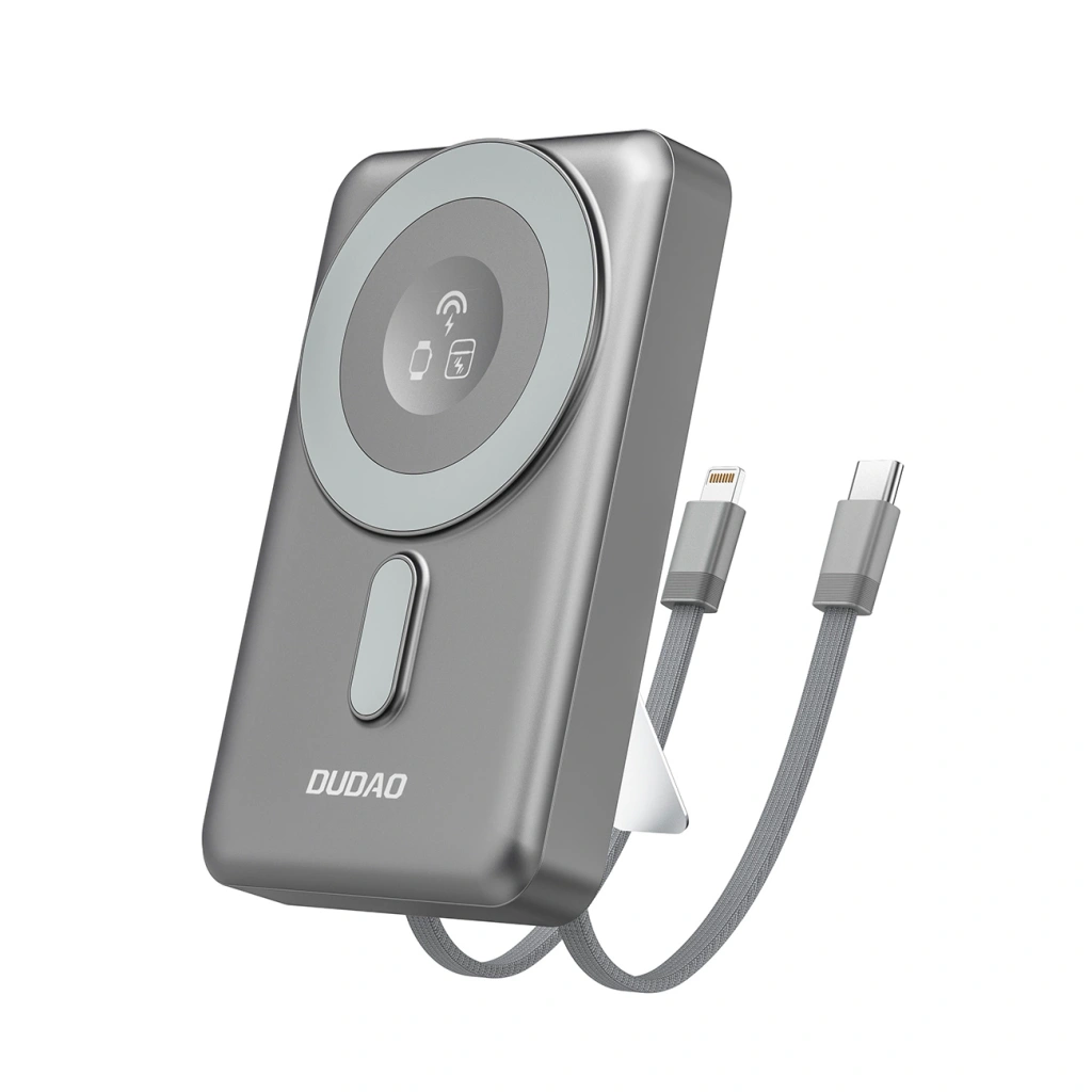 • Powerbank Dudao K29 10000mAh PD 20W z MagSafe z metalową obudową, podstawką i wbudowanymi kablami USB-C/Lightning - szary