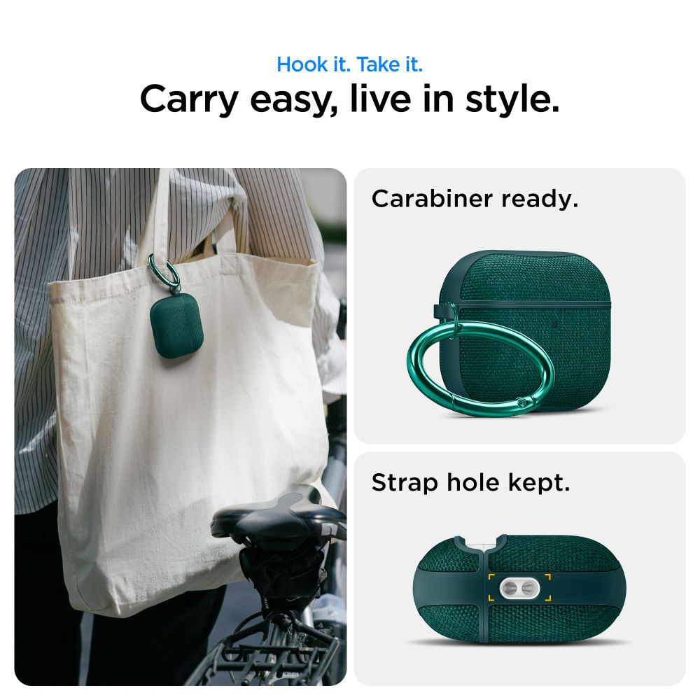Elegantes hülle Urban Fit für Apple AirPods Pro von Spigen. Hülle besteht aus einer haltbaren Kombination aus Polycarbonat (PC) und Nylon, die die Kopfhörer hervorragend vor Beschädigungen schützt und Komfort für den täglichen Gebrauch bietet. Präzise geschnittene Löcher ermöglichen den nahtlosen Anschluss des Ladegeräts, und die volle Kompatibilität mit drahtlosem Laden garantiert maximale Funktionalität.