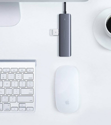 Eleganter HUB mit USB-Typ-C-Stecker und vier USB-3.2-Gen-1-Anschlüssen Ein sensationelles Gadget, das die Möglichkeiten Ihres Laptops oder Smartphones (Geräte mit USB-Typ-C-Anschluss) um völlig neue Funktionen erweitert. Sie können damit unter anderem Flash-Laufwerke oder externe Laufwerke anschließen, die Geräte mit Expressgeschwindigkeit aufladen und einen Projektor oder Fernsehbildschirm verwenden. Perfekt für Leute, die alle Ports an ihrem Computer voll haben.