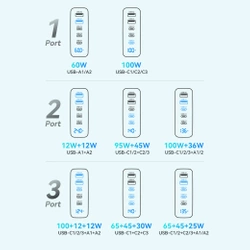 - USB-C 1 / USB-C 2 / USB-C 3 + USB-A 1 + USB-A 2: 100 W + 12 W + 12 W