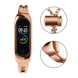 Elegantes Armband für das Xiaomi Mi Band 3/4/5/6, in einer schönen Farbe. Das Accessoire aus glattem Edelstahl hat eine ergonomische Form, die sich der Form des Handgelenks anpasst. Das Stirnband wird mit einem Clip mit einer dekorativen Kette befestigt, die mit einem Zirkon veredelt ist.