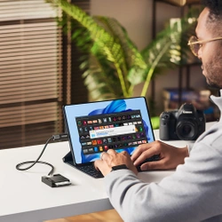 The device is made of high-quality materials. It looks elegant, small and handy. Easily fits in a bag or backpack. The built-in 0.5 m cable enables the reader to be connected even further away from the computer.