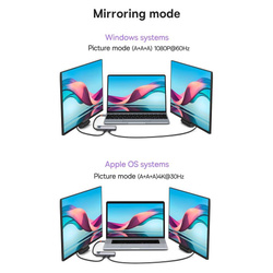 Si desea ver películas en la pantalla grande directamente desde su computadora portátil, no podría ser más fácil. El dispositivo está equipado con dos tomas HDMI, gracias a las cuales podrá conectar cómodamente su computadora portátil al televisor y disfrutar de películas de alta calidad. Además, cuando se conecta otro monitor, el HUB puede operar en los siguientes modos: extensión de imagen o copia.