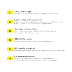 - Salidas: USB1 / USB2 18W (5V / 3A , 9V / 2A, 12V / 1.5A); USB tipo C de 20 W (5 V/3 A, 9 V/2,22 A, 12 V/1,5 A)