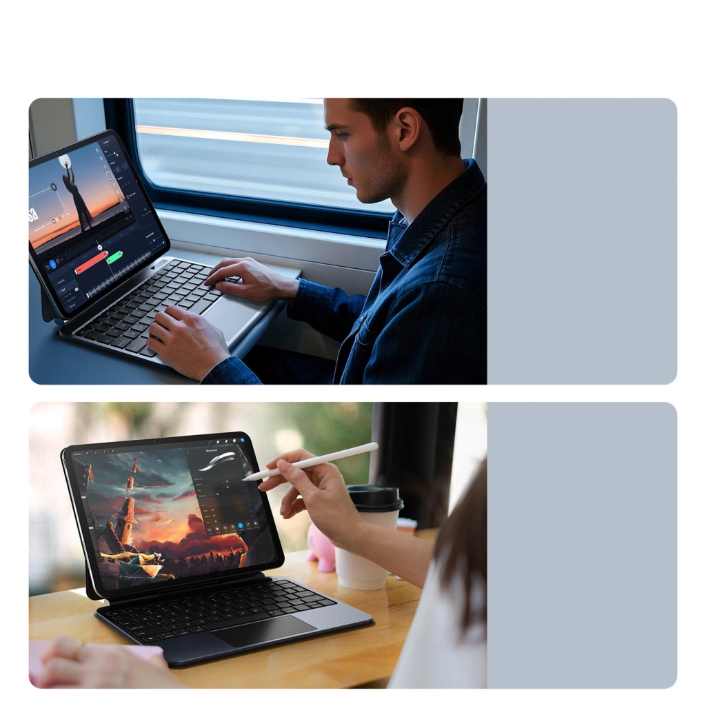 Etui z klawiaturą Dux Ducis (MK series) to eleganckie i funkcjonalne akcesorium stworzone dla iPada Pro 11" (2024). Aluminiowy wspornik z magnetycznym mocowaniem umożliwia wygodne dopasowanie kąta widzenia i wspiera prawidłową postawę przy pracy. Pełnowymiarowa klawiatura z mechanizmem nożycowym i podświetleniem w 7 kolorach zapewnia komfortowe pisanie, a touchpad obsługujący gesty wielodotykowe ułatwia nawigację. Dzięki funkcji automatycznego oszczędzania energii etui wydłuża czas działania, a solidna konstrukcja z PU i TPU skutecznie chroni urządzenie. To połączenie stylu, ergonomii i praktyczności w jednym akcesorium.