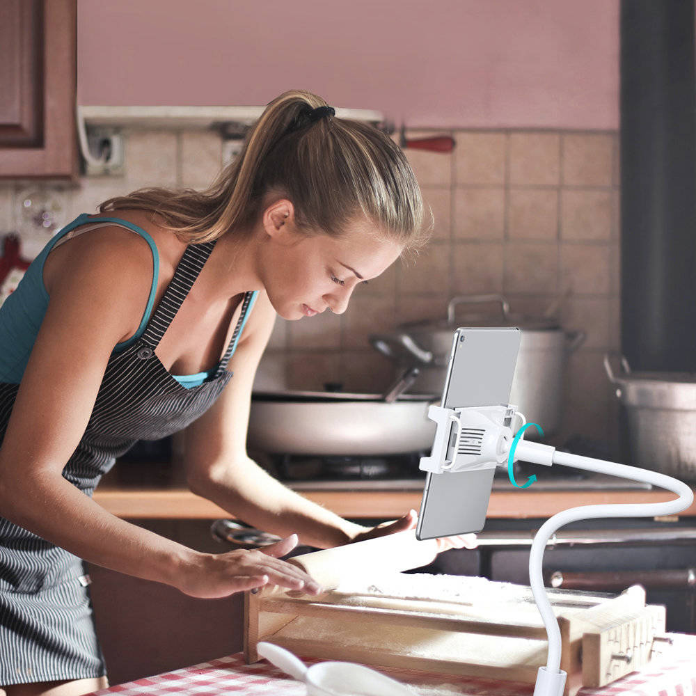 The flexible arm is stable and flexible. It's a typical lazy holder: the head rotates 360 degrees, so you can place your phone, tablet, and even the Nintendo Switch console horizontally or vertically. The jaws open to a width of 24.6 cm and are therefore compatible with devices measuring 4.7 - 9.7 ”.
