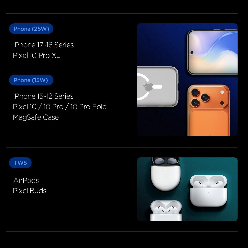 Spigen La Essential EF302MOQ Qi2.2 es una estación de carga innovadora y compacta diseñada para ofrecer la máxima comodidad y rendimiento. El dispositivo es compatible con el último estándar Qi 2.2, que ofrece carga inalámbrica rápida de hasta 25 W para smartphones y hasta 5 W para auriculares inalámbricos como AirPods y Pixel Buds, lo que permite alimentar dos dispositivos simultáneamente en un solo lugar.