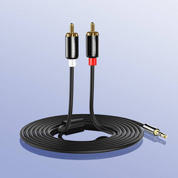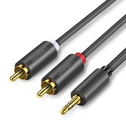 An analog audio cable from the Ugreen company, with a 3.5 mm stereo mini jack plug on one end and two RCA plugs on the other. It allows you to connect your phone, smartphone or other device to audio equipment.