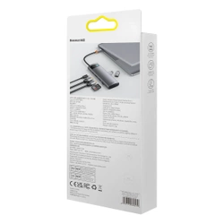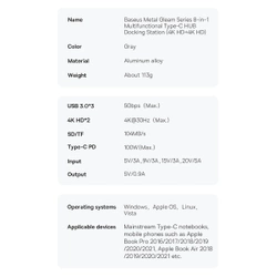 Station d'accueil Baseus Metal Gleam Series 8-en-1 USB Type C HUB - 2 x HDMI / 3 x USB 3.2 Gen. 1 / 1 x Power Delivery / 1 x lecteur de carte SD / 1 x lecteur de carte TF gris (WKWG050113)