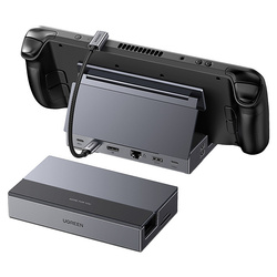 Adapter Ugreen CM800, na którym leży przenośna konsola do gier, w tle osoba korzysta z klawiatury.