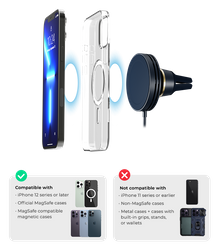 Velox Mini to nasz najbardziej kompaktowy bezprzewodowy uchwyt wentylacyjny! Zaprojektowany wyłącznie dla iPhone'ów i etui kompatybilnych z MagSafe, Velox Mini zapewnia do 7,5 W mocy. Wystarczy przyłożyć telefon do powierzchni uchwytu, a silne magnesy utrzymają go na miejscu w idealnym ustawieniu.