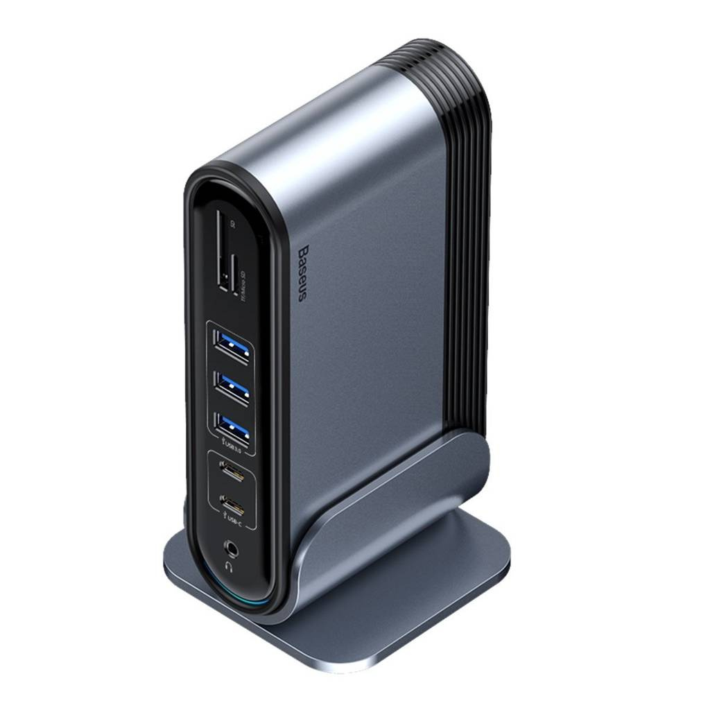 Hub Baseus has RJ45, DC 12V, 4K HDMI, 2x USB 2.0, VGA HD, 1x minijack 3,5 mm, 2x USB-C, and 3x USB 3.0, SD and micro SD memory card.