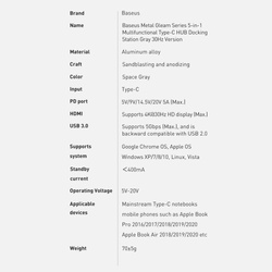 • Baseus Metal Gleam Series 5-en-1 Station d'accueil multifonctionnelle HUB Type-C Gris Version 30Hz Gris
