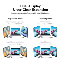 Si vous voulez regarder des films sur grand écran directement depuis votre ordinateur portable, rien de plus simple. Le gadget est équipé de deux prises HDMI, grâce auxquelles vous pourrez facilement connecter votre ordinateur portable au téléviseur et profiter de films de haute qualité. De plus, lorsqu'un autre moniteur est connecté, le HUB peut fonctionner dans les modes suivants : extension d'image ou copie.