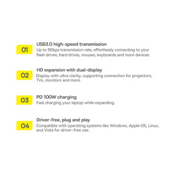 Le Baseus vous permettra de travailler ou de jouer en toute liberté. Tout cela grâce au grand nombre de ports et de prises disponibles. Les nouveaux ordinateurs portables n'ont souvent pas assez de prises USB ou HDMI. Grâce au Baseus , vous n'avez pas à vous soucier de leur manque. De plus, vous trouverez un port Ethernet RJ-45.
