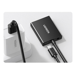 Adaptateur unidirectionnel Ugreen, qui sert à convertir le signal analogique provenant du port VGA vers le port HDMI. Permet de connecter un ordinateur avec un connecteur VGA à un téléviseur, un projecteur, un moniteur avec un connecteur HDMI. De plus, l'adaptateur est équipé d'un connecteur d'alimentation USB-C.