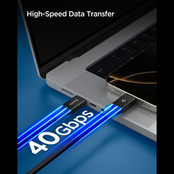Kabel obsługuje transfer danych do 40 Gb/s zgodnie ze standardem USB4 Gen3, co pozwala na szybką synchronizację dużych plików i płynną pracę z dyskami zewnętrznymi czy stacjami dokującymi. Jest kompatybilny z urządzeniami Thunderbolt 3 i 4. Dzięki obsłudze DisplayPort 2.0 można przesyłać obraz w rozdzielczości 8K na jednym monitorze lub 4K na dwóch monitorach jednocześnie, co sprawdza się przy pracy z wieloma wyświetlaczami.