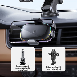 Produkt ma niesamowity wygląd, gdyż w trakcie pracy uchwyt magicznie podświetla się kolorowym światłem LED- w ciemności jest to szalenie efektowne i praktyczne bo pomaga w odnalezieniu uchwytu i montażu telefonu.