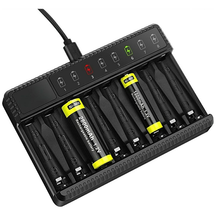 | Parametry | Wejście (Input): 5V == 2A (zasilanie przez kabel USB) Wyjście (Output): 1.48V == 0.6A × 8 Wyświetlacz LED: Każde z 8 gniazd posiada własny wskaźnik ładowania, informujący o stanie naładowania akumulatora Zabezpieczenia: Ochrona przed przegrzaniem, przepięciem i zwarciem Certyfikaty: CE, FCC, RoHS |