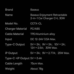 • Baseus Enjoyment Retractable 2-in-1 Car Charger C+L 30W Black