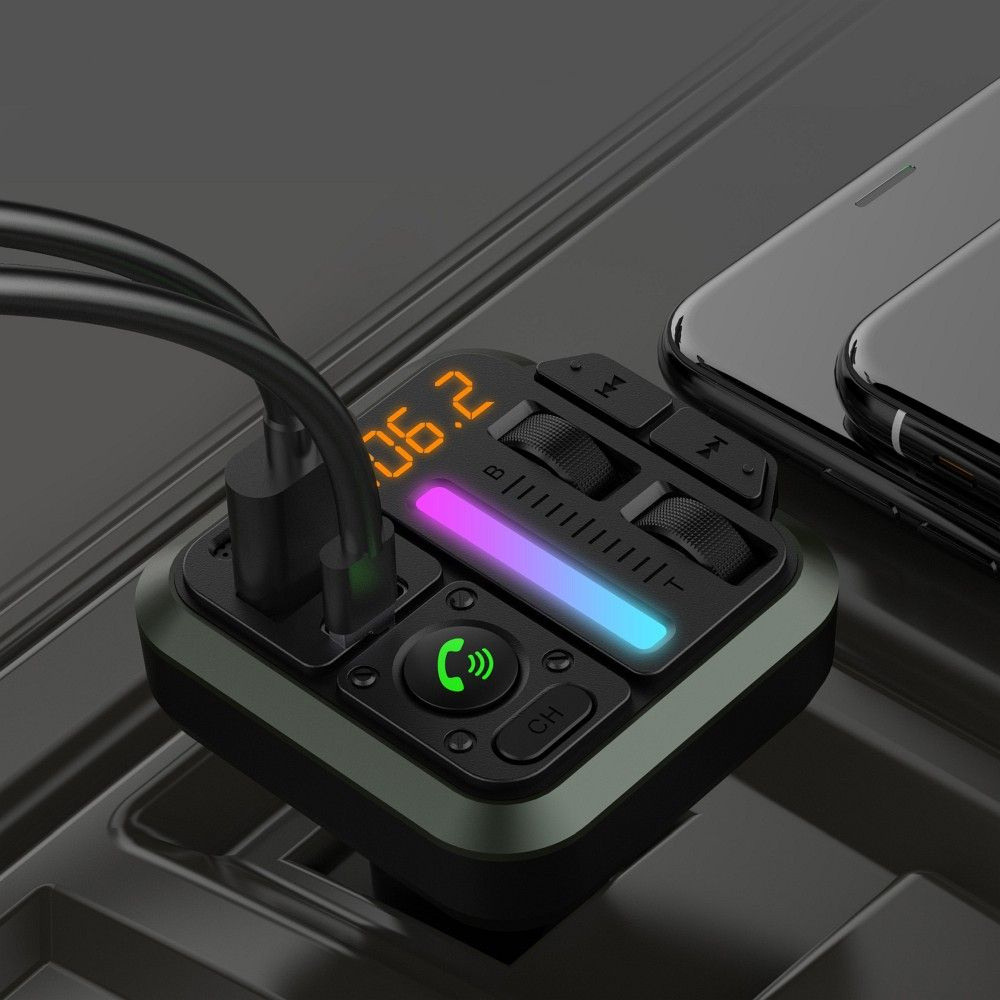 Transmiter FM do samochodu BLUE STAR AutoBeat MT04B z 2 portami - USB-A i USB-C - do szybkiego ładowania i technologią Bluetooth. Dzięki nadajnikowi FM można słuchać muzyki ze smartfona w trakcie jazdy, a wbudowany mikrofon pozwala prowadzić rozmowy głośnomówiące.