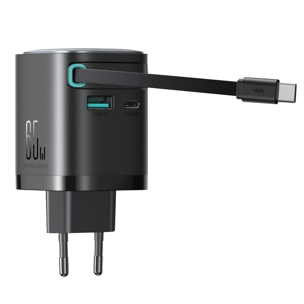 Joyroom JR-TCL02 GaN-Ladegerät mit einer Leistung von bis zu 65 W mit USB-A- und USB-C-Anschlüssen und einem integrierten USB-C-Kabel – Schwarz
